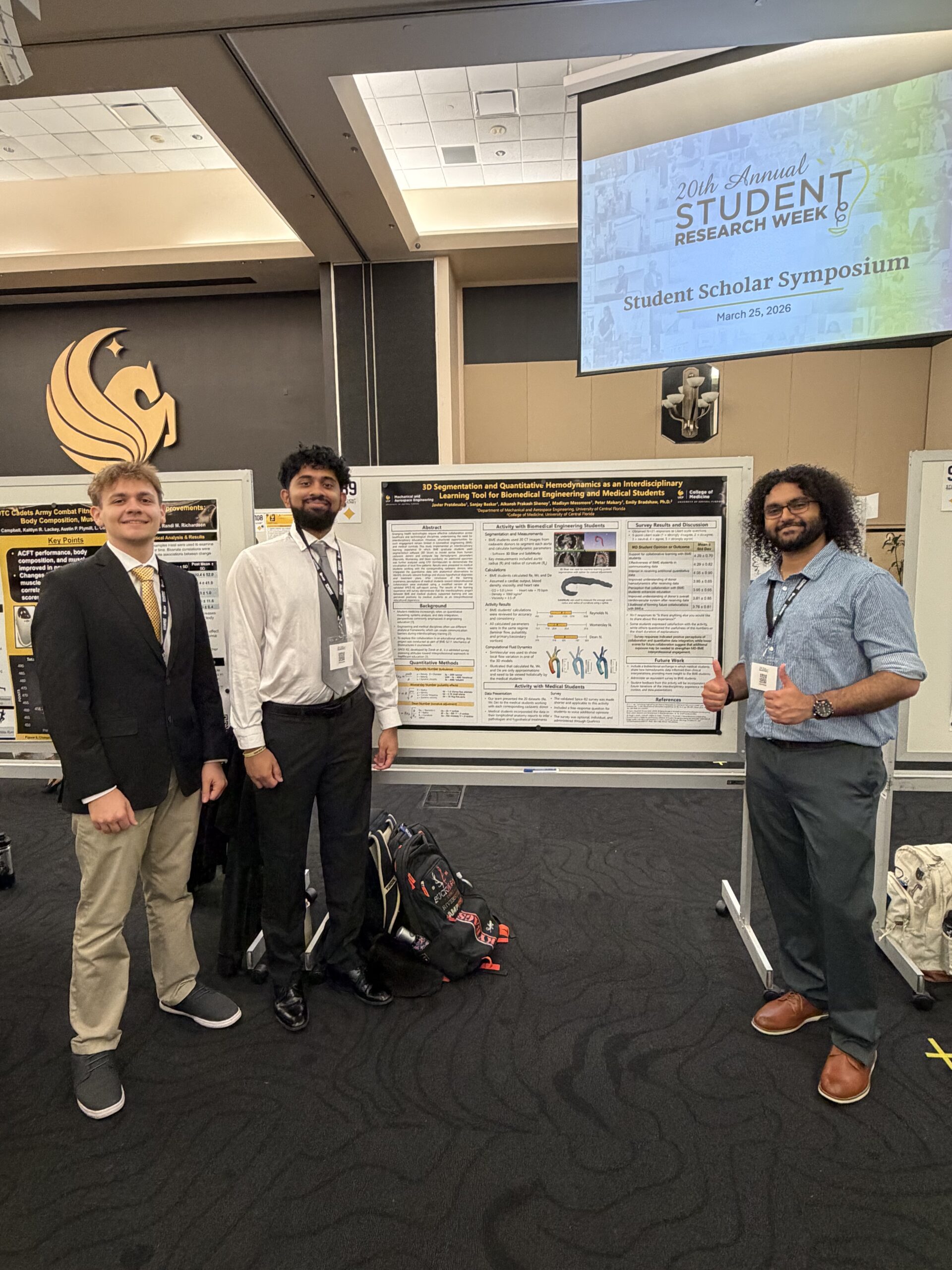 Javier Pratdesaba and his team from Dr. Emily Bradshaw’s Biostructures graduate course presented their project at the 2026 Student Scholar Symposium at UCF. Their poster was titled “3D Segmentation and Quantitative Hemodynamics as an Interdisciplinary Learning Tool for Biomedical Engineering and Medical Students”.